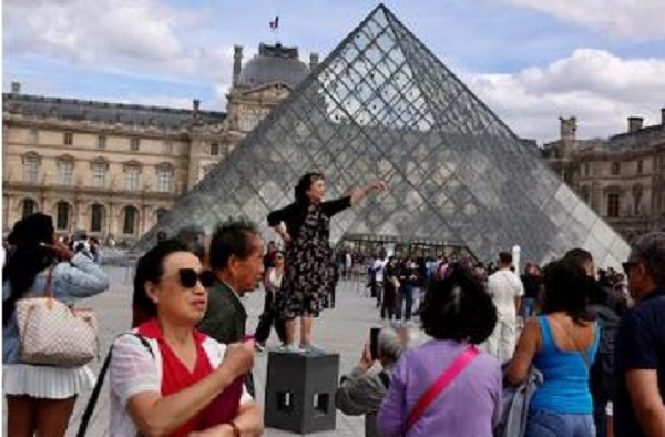 Tourists at the Louvre pose for pictures at the Paris Louvre Museum